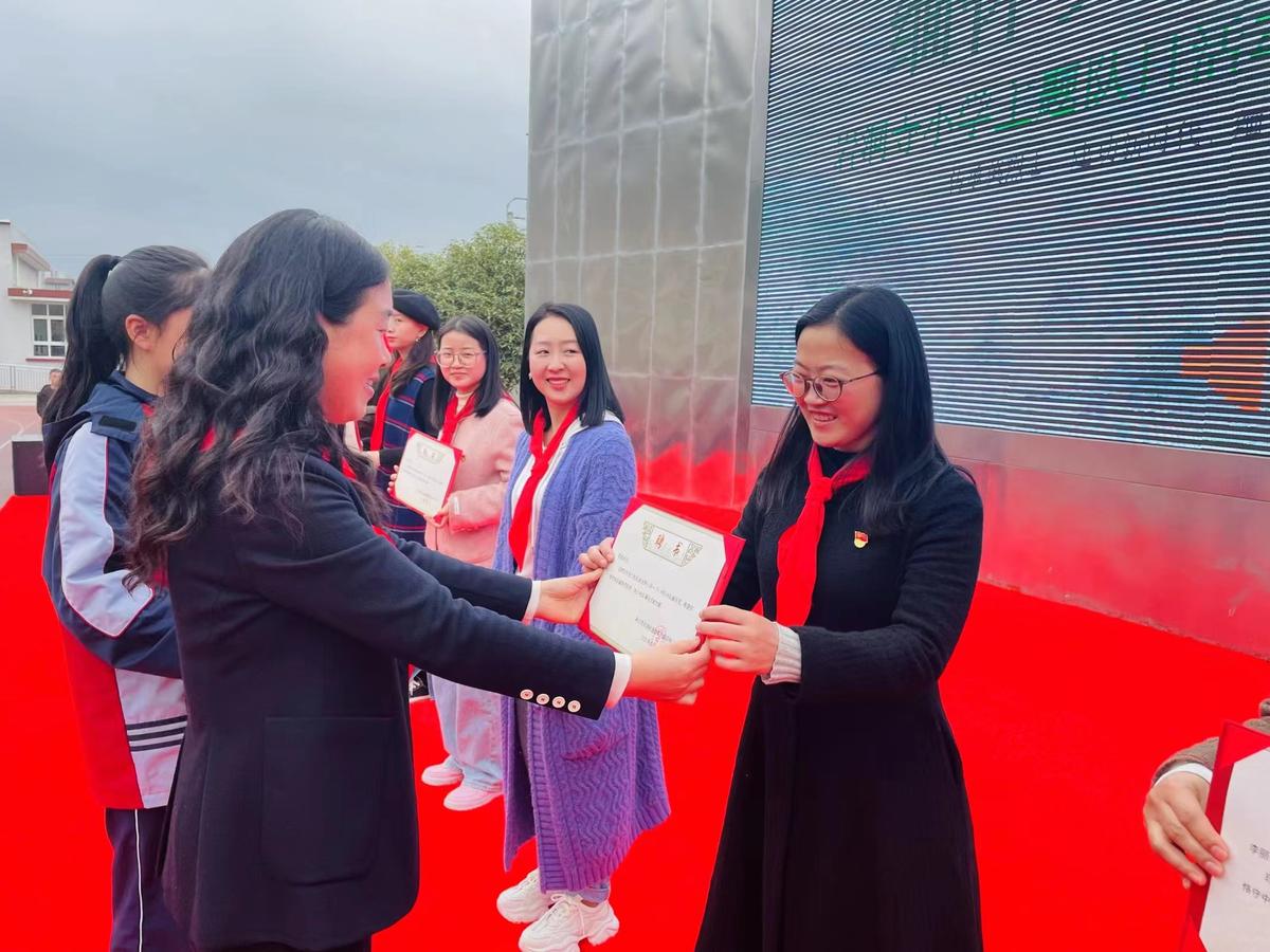 当天,岩洞寺小学一年级创建新的中队,90名优秀学生率先加入少先队这个光荣集体。全体新队员宣誓、唱队歌,并为新建中队辅导员颁发聘书。