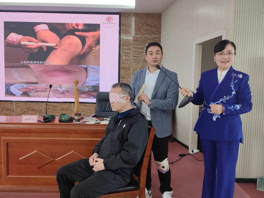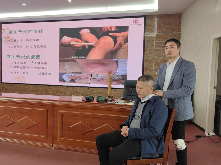 蕲春火针疗法传承人蒋洪军,以《肩颈、腰痛症状调理》为主题,对肩周炎、颈椎病、腰痛、膝关节炎四大常见疾病的病因、症状、艾灸选穴、功能锻炼逐一进行分析讲解和现场示范,具有较强的理论指导性和实践可操作性。