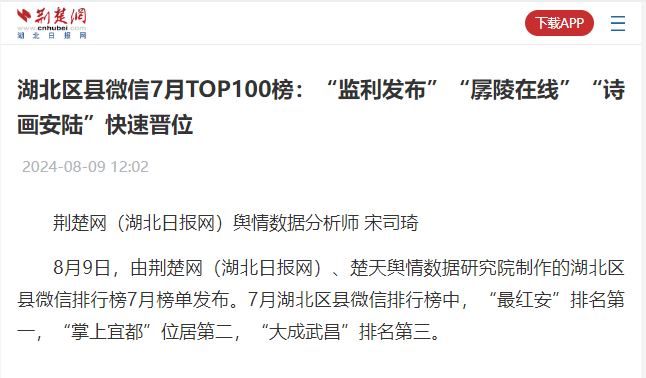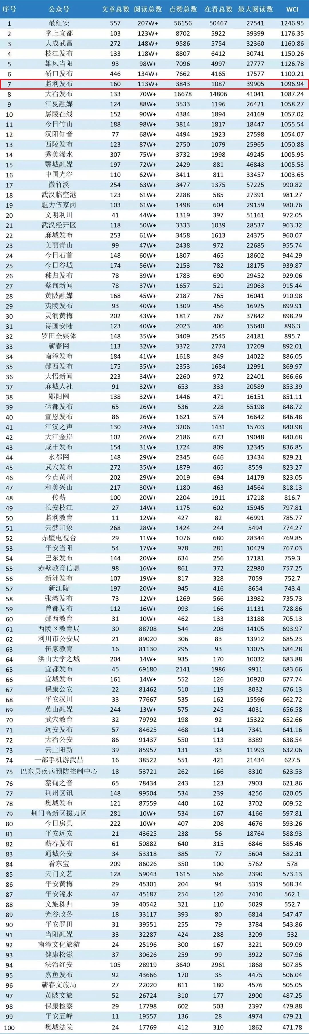 湖北政务微信排行榜聚集湖北省内主要党政机关政务微信公众号,根据WCI指数数据进行科学排行,主要从整体传播力、篇均传播力、头条传播力、峰值传播力等四个维度进行评价,对全省县市区级媒体微信公众号进行数据监测和综合排名。