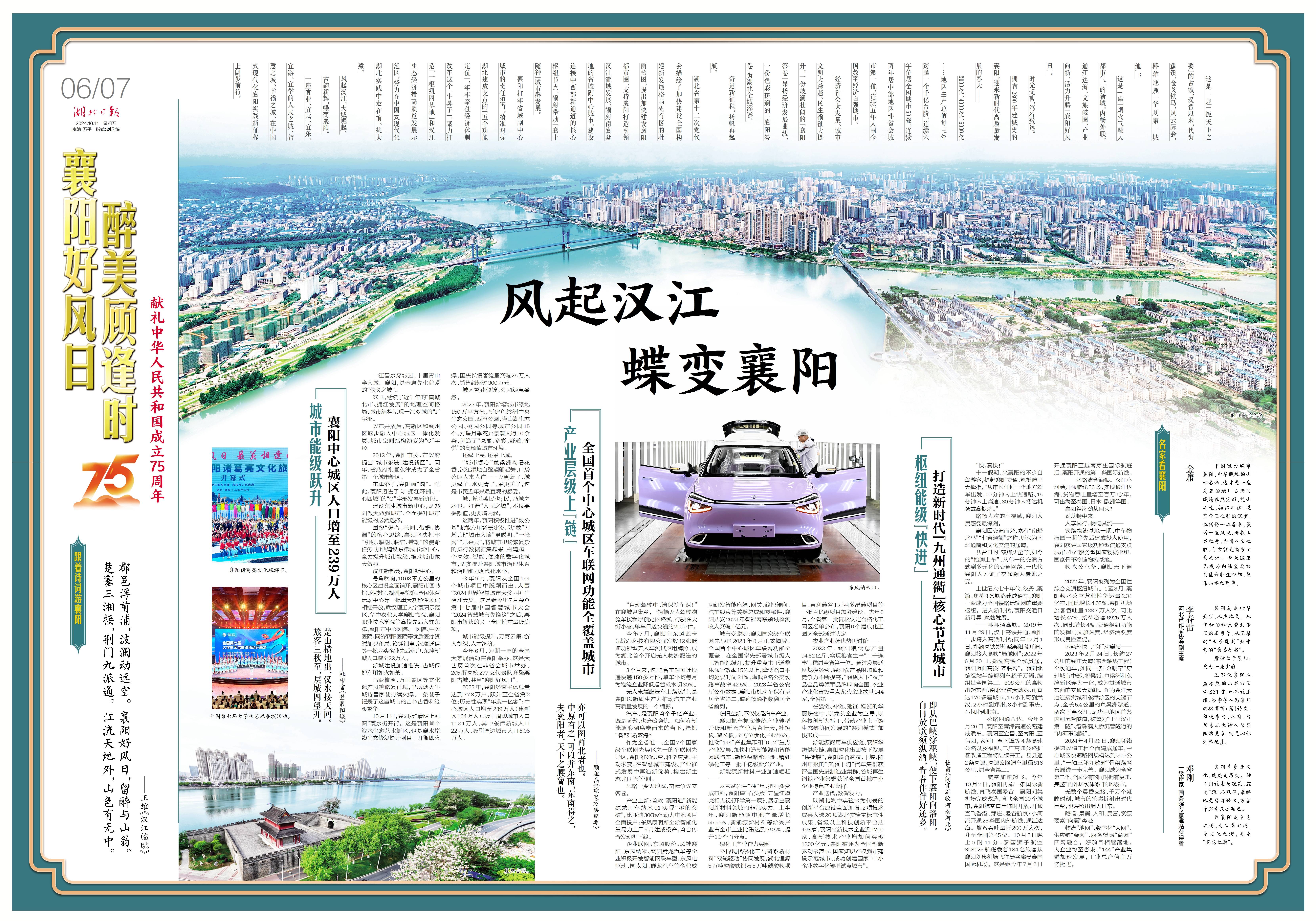 10月11日,湖北日报重磅推出创意通版特刊《襄阳好风日 醉美顾逢时》,首篇通讯“风起汉江 蝶变襄阳”,全景式展现省域副中心城市襄阳的新成就、新特色、新风貌,献礼中华人民共和国成立75周年。今日起,湖北日报全媒体平台将陆续推出系列特刊内容,敬请期待。