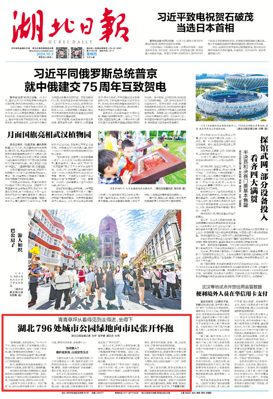 10月3日,湖北日报头版报道《青青草坪从看得见到走得进、坐得下——湖北796处城市公园绿地向市民张开怀抱》,聚焦襄阳市月亮湾公园“人民至上”的管理理念。
