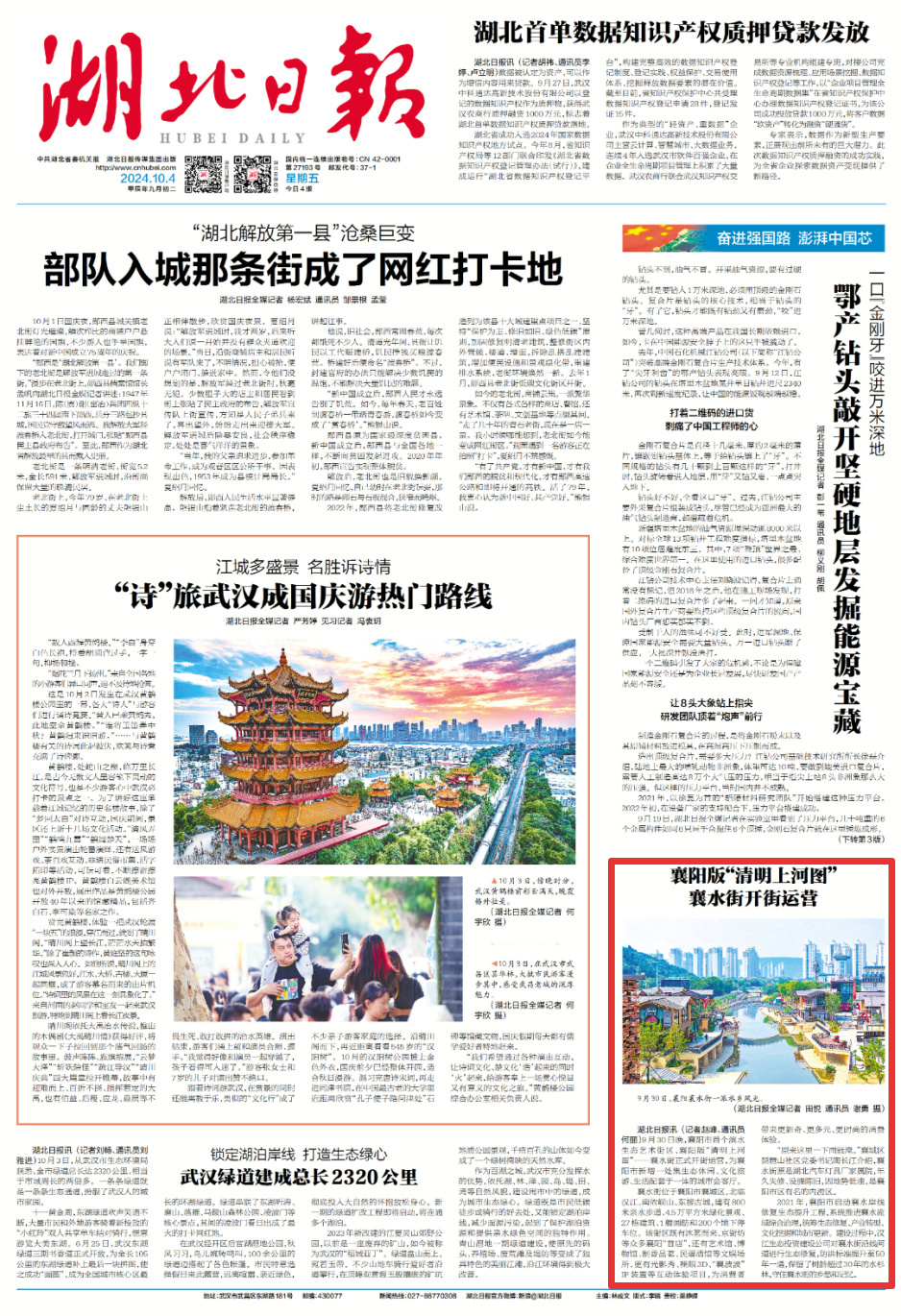 10月4日,湖北日报头版报道《襄阳版“清明上河图”襄水街开街运营》,聚焦襄阳新地标——襄水街开街。