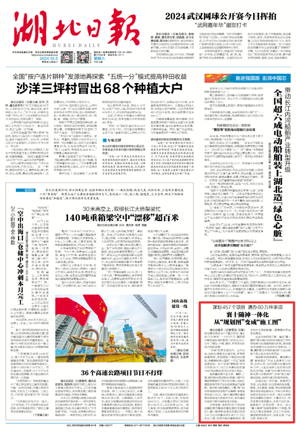 10月5日,湖北日报头版报道《谋划457个项目 通办60万件事项—— 襄十随神一体化从“规划图”变成“施工图”》 ,聚焦襄十随神同向发力的新进展。
