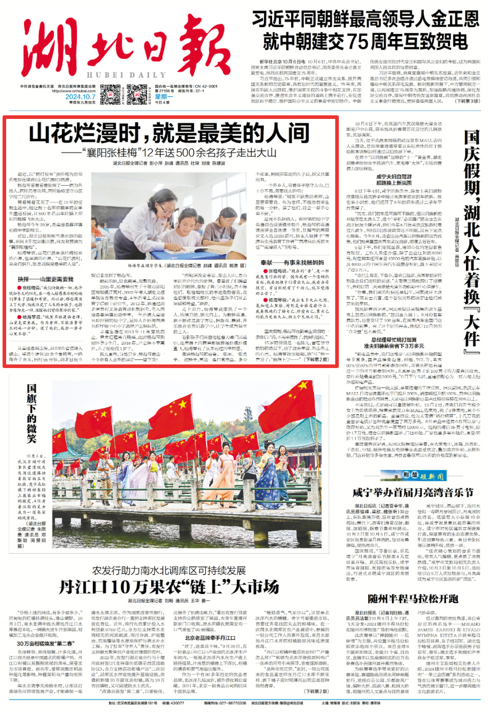 10月7日,湖北日报头版头条报道《山花烂漫时,就是最美的人间——“襄阳张桂梅”12年送500余名孩子走出大山》讲述南漳教师杨海琴的感人故事。