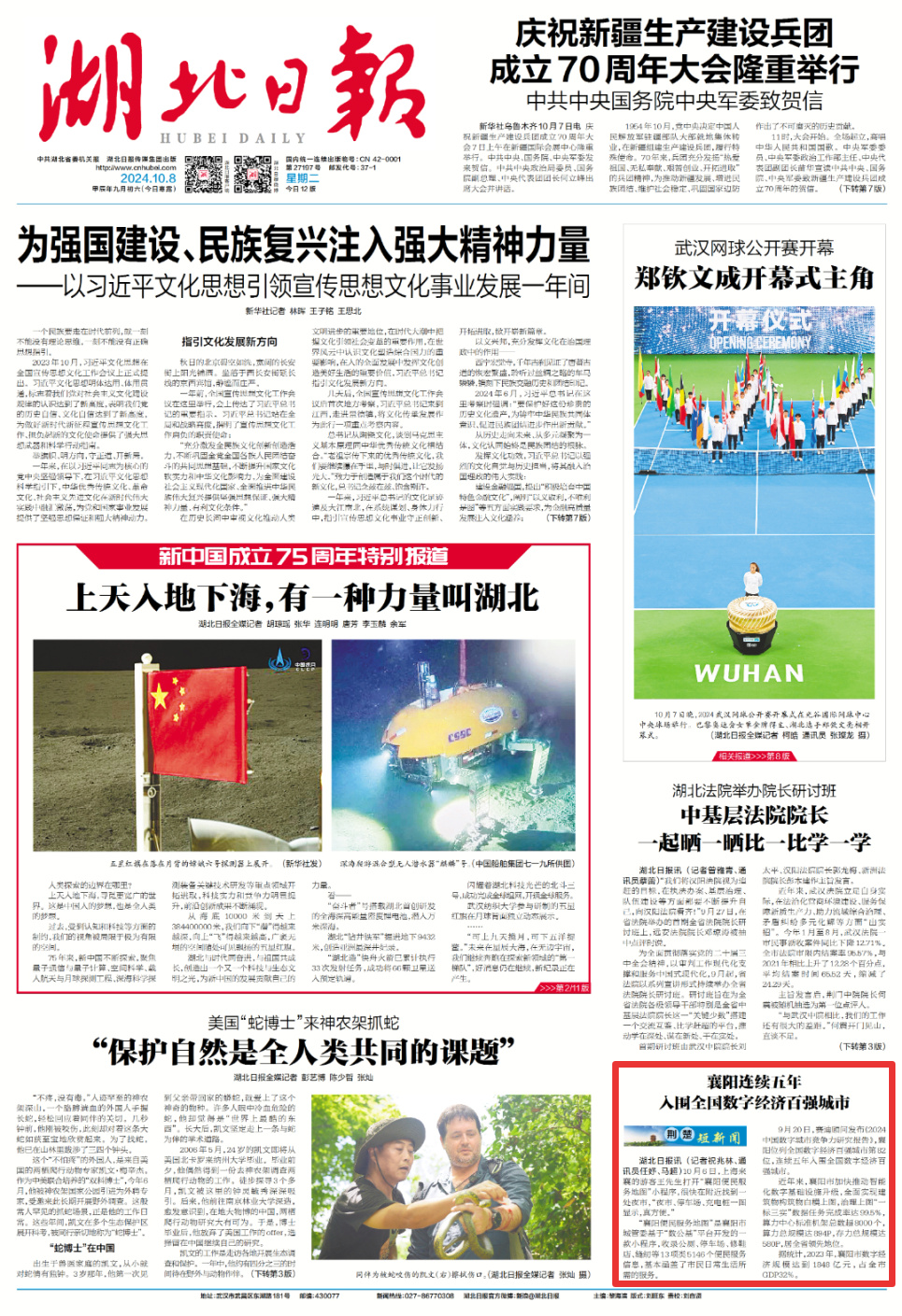 10月8日,湖北日报头版报道《襄阳连续五年入围全国数字经济百强城市》聚焦襄阳数字经济发展。