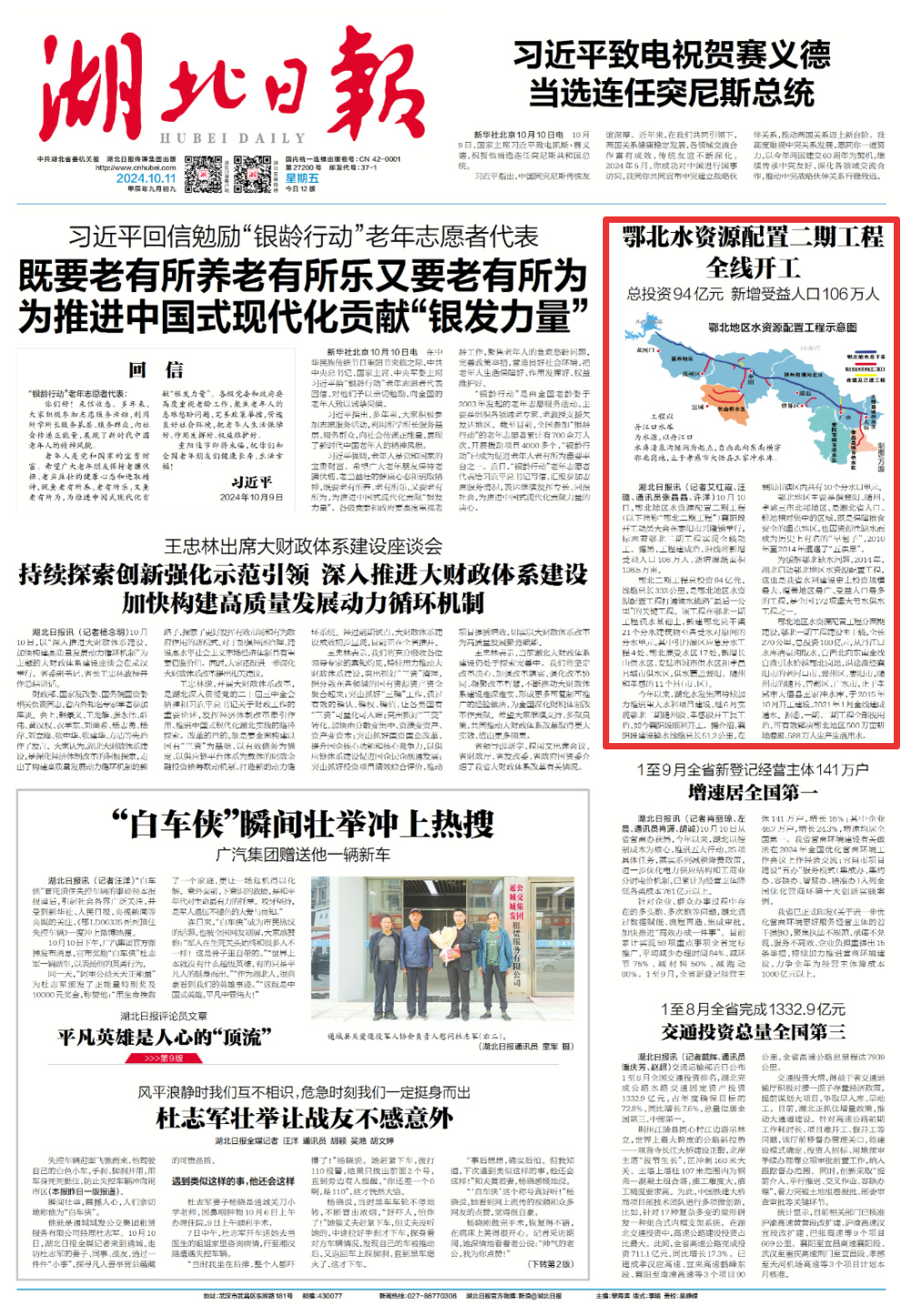10月11日,湖北日报头版报道《鄂北水资源配置二期工程全线开工 总投资94亿元 新增受益人口106万人》, 聚焦在枣阳市兴隆镇举行的鄂北地区水资源配置二期工程襄阳段开工动员大会。