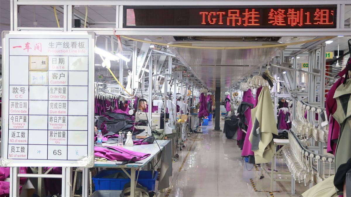 在全智能自动吊挂系统流水线上,一排排悬挂的布料像坐上“高铁”,被精准分配到不同工位,由工人取下,裁剪、熨烫、拼块,一气呵成。