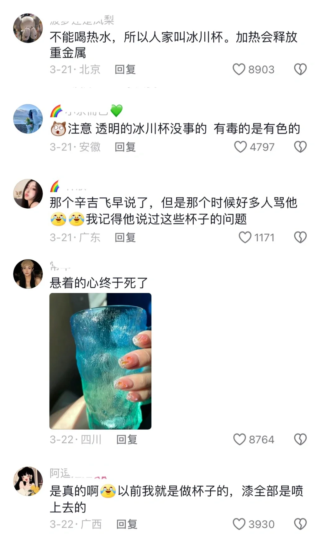 像这种彩色雾朦胧没感到冰川杯,它的颜色其实是电镀上去的非常不稳定,在高温或者消雾摩擦的情况下,