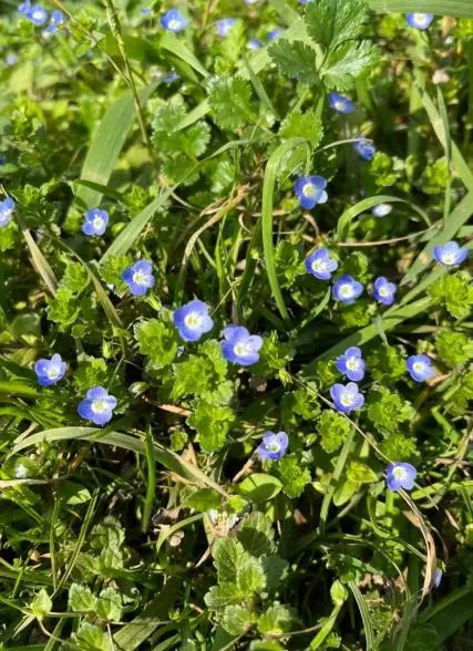 草地上,蓝色小花悄然绽放,与阳光共舞,为春天的画卷增添一抹清新的亮色。