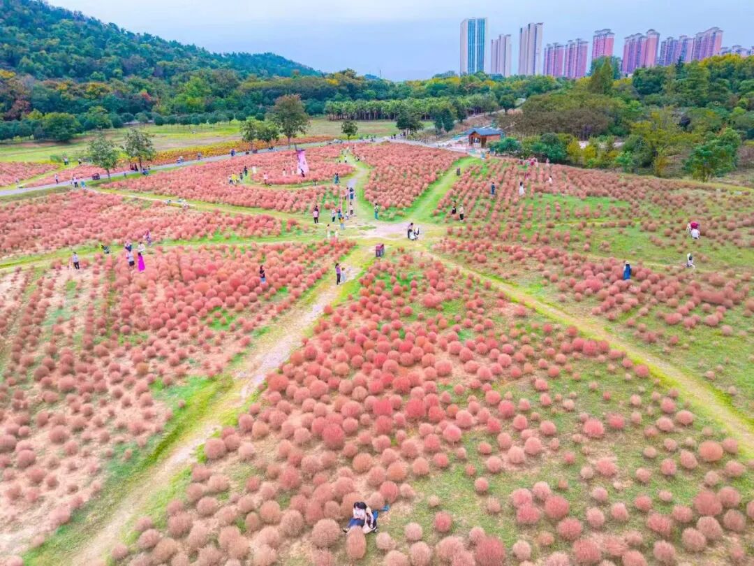 在马鞍山森林公园梦花源,记者看到,圆滚滚的粉红地肤草连绵起伏,孩子们成群结伴在小道上尽情奔跑;大人们则沉浸依偎在连绵的花丛中拍照打卡。