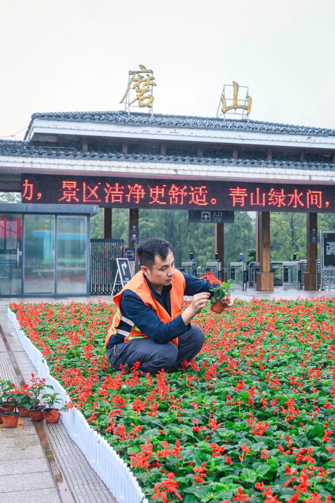 磨山景区工作人员在景区大门布置盆栽扎景。