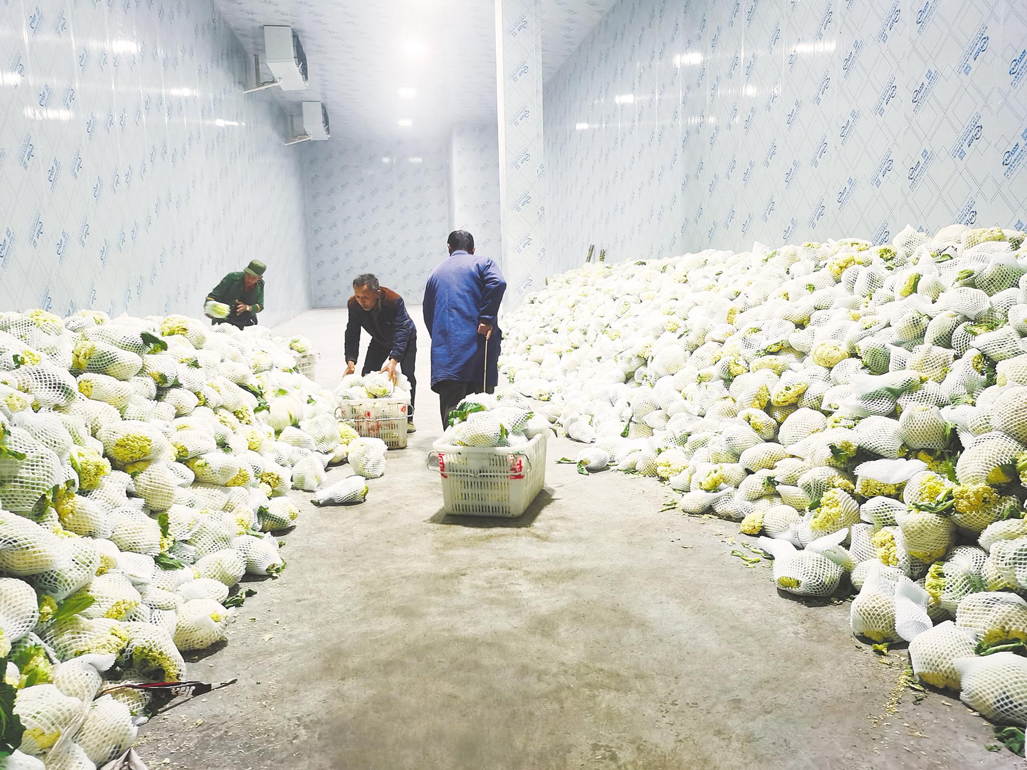 云梦县红新果蔬种植专业合作社员工在冷藏保鲜库搬运花菜。 (受访单位供图)