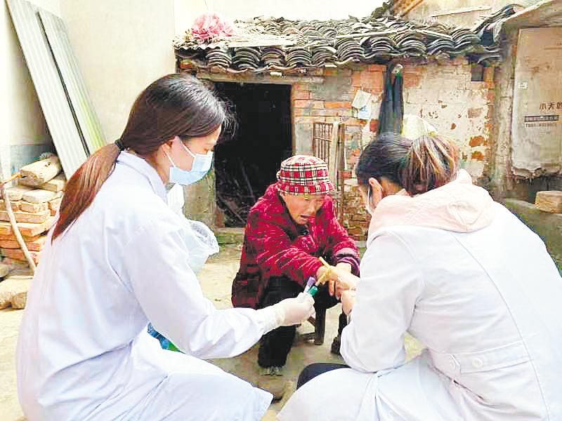 孝昌县花园镇卫生院为行动不便的老人提供上门诊疗服务。 (视界网 殷靖 摄)