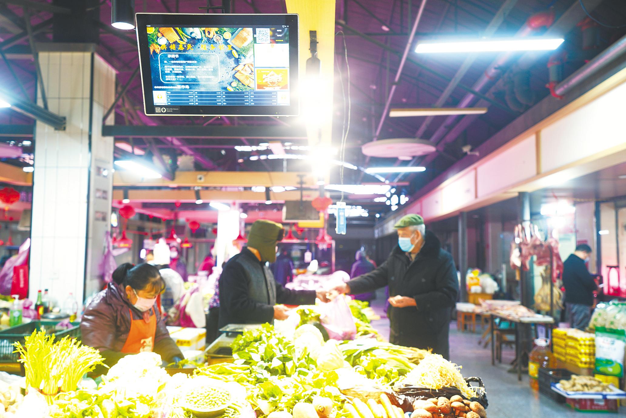 在菜场入口处,一块硕大的显示屏映入眼帘。实时交易额、交易人次、今日菜价、农残检测等信息,一目了然。