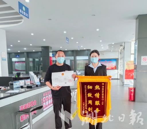 湖北日报客户端讯(通讯员殷何卿 陈新欣 严会)近日,丹江口市红甘苹智慧农业科技有限公司副经理叶伟将一面印有“热情服务、细致周到”的锦旗送至该市均县镇政务服务大厅,感谢政府一路为企业发展保驾护航。
