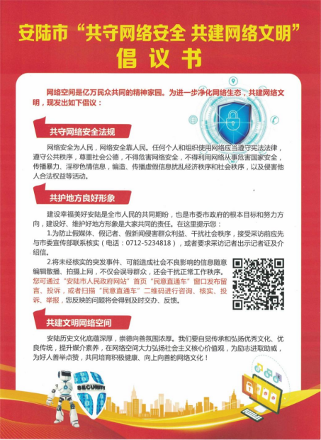 印制2万份《安陆市“共守网络安全 共建网络文明”倡议书》宣传海报,并组织多名志愿者在街道、公园、广场等公共场所向群众分发宣传海报,积极宣传网络安全法律法规、有害信息举报、网络文明建设等相关网络安全知识。引导群众通过扫描宣传海报上的二维码,进入安陆市人民政府网站“民意直通车”窗口,呼吁广大群众积极投诉、举报不良信息,共树网络文明之风,共筑网络安全防线。