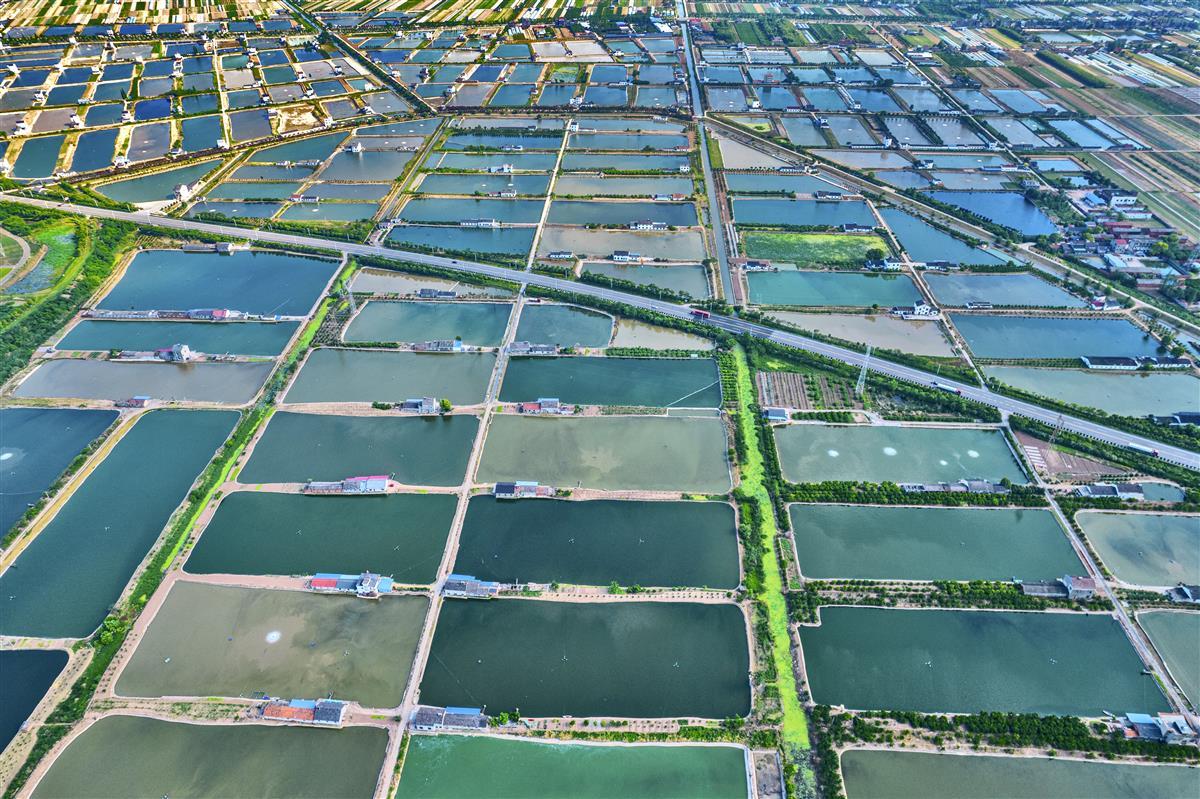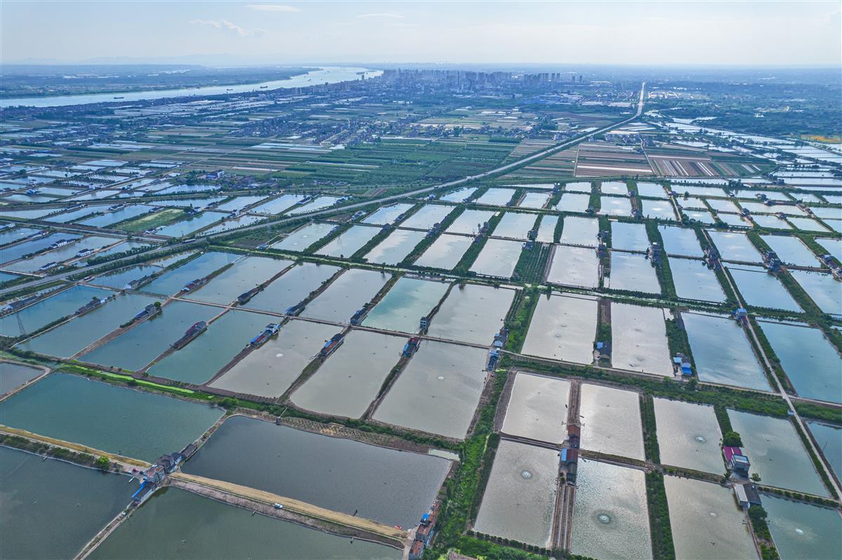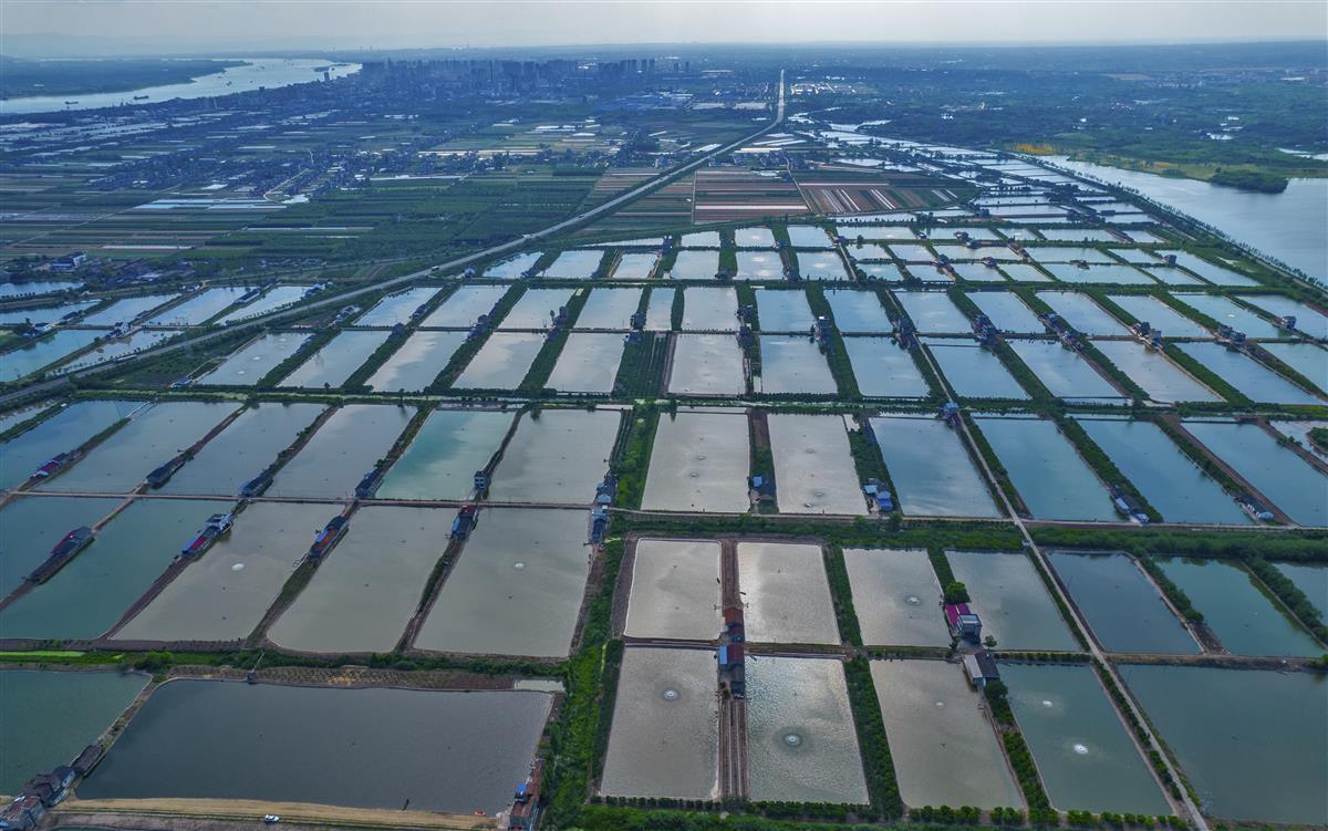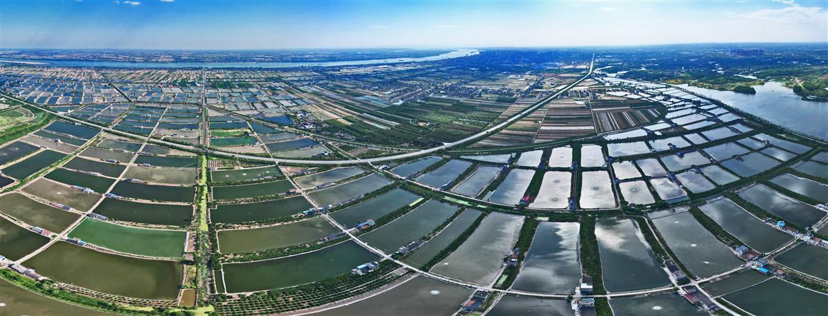 5月16日,鸟瞰长江边的枝江市金湖村的千亩鱼塘如同扑面而来的美丽画卷,星罗棋布的养殖水面波光粼粼,天上白云倒映在水面上,呈现一幅幅鸟飞鱼跃的生态美景。