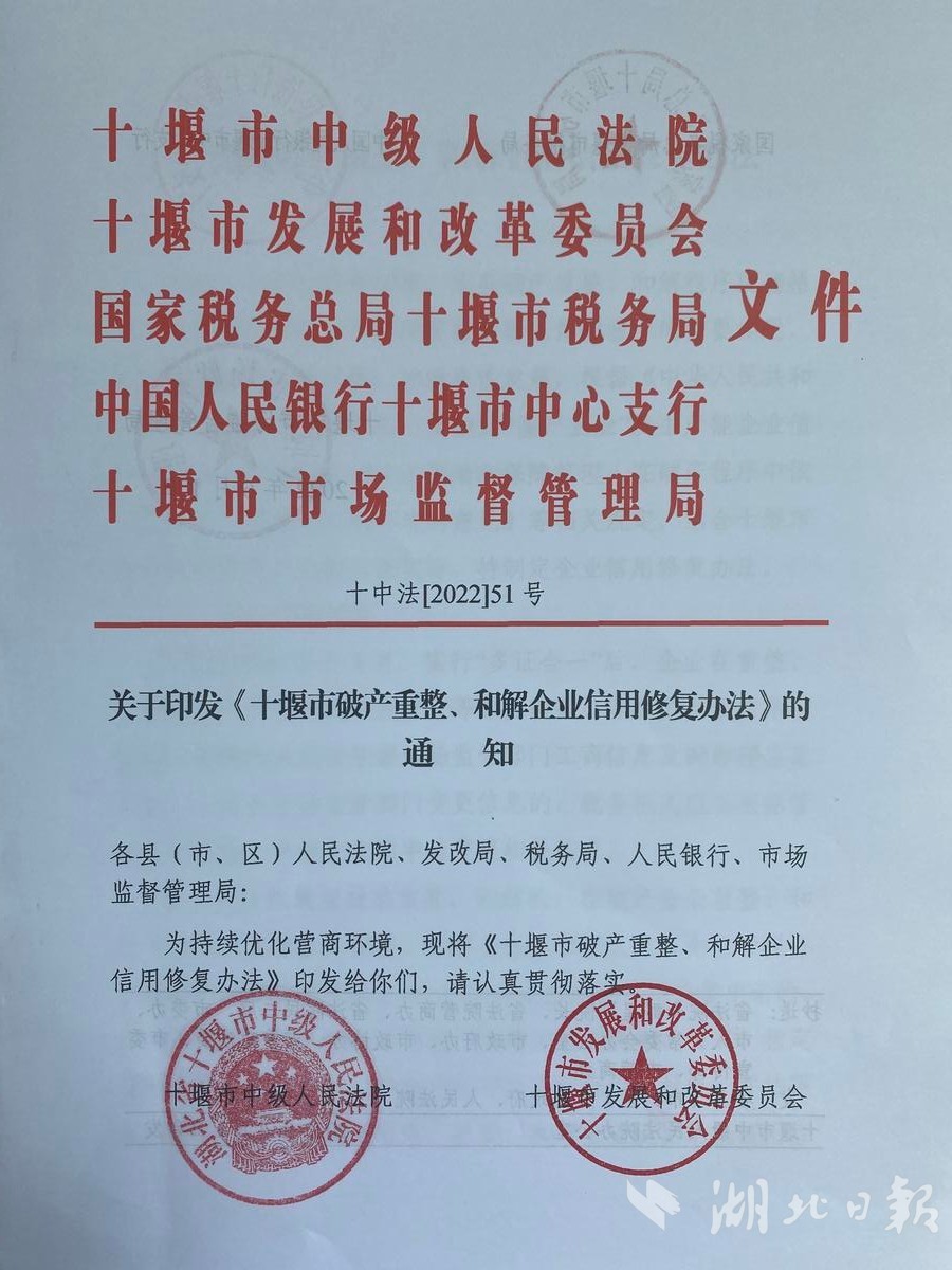 湖北日报讯(通讯员杨娇、陈晓苏)原有负面信用记录是破产重整企业再生的障碍。6月1日,《十堰市破产重整、和解企业信用修复办法》出台,推行破产重整、和解企业信用修复。