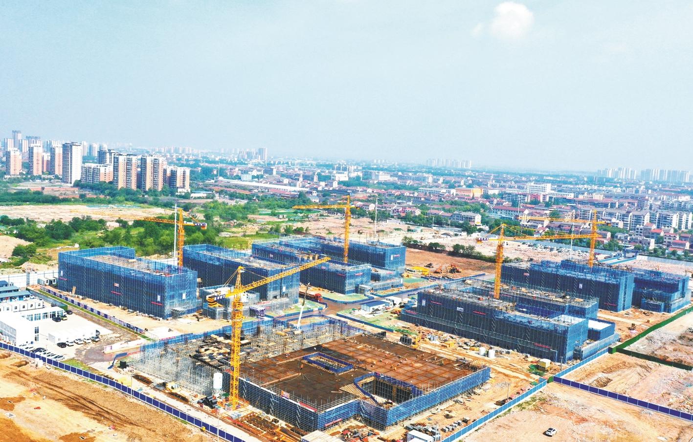 工地不见灰尘,绿植处处可见。5月下旬,在荆州大学城二期A区施工现场,机器轰鸣、吊臂起落,多栋建筑的脚手架随着如火如荼的建设,节节拔高。