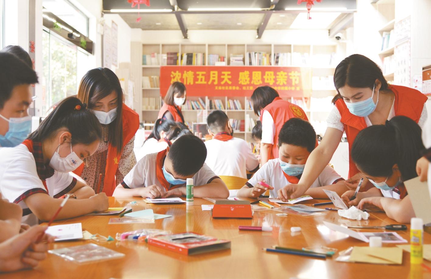 社区志愿服务队与社区儿童一起做手工。