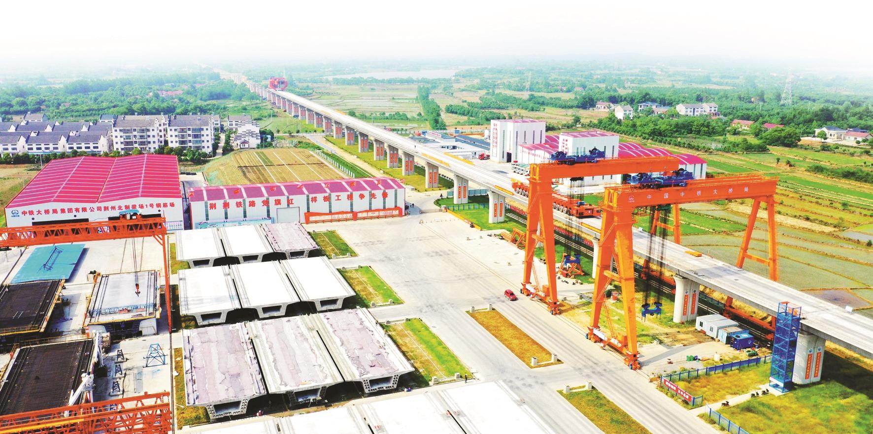 3标荆州北制梁场技术负责人吕创龙介绍,作为高铁桥梁上部结构的第一站,预制箱梁的施工质量关乎整个高铁的生命。荆荆铁路3标总共有538榀箱梁的预制任务,占整个桥梁总里程的98%。为保证施工工期,项目部充分调度各种资源,使梁场满负荷运行,箱梁预制能够达到2-3榀/天。