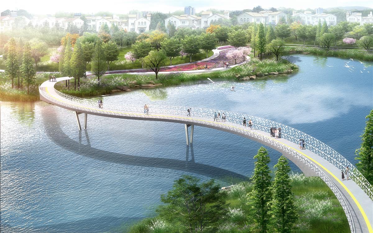 湿地吧人工湖S形桥效果图。