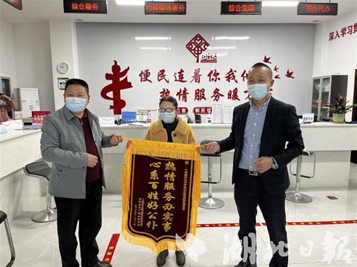 湖北日报客户端讯(通讯员 刘爱理)11月21日上午,十堰经开区东环世纪广场小区业委会和物业公司将一面印有“热情服务办实事、心系百姓好公仆”的锦旗送到白浪堂社区,对社区干部千方百计帮助小区居民协调办理不动产证表达感谢。