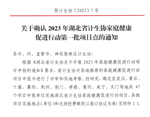湖北日报客户端讯(通讯员 金燕)7月5日,湖北省计生协《关于确认2023年湖北省计生协家庭健康促进行动第一批项目点的通知》发文,安陆市青春健康·同伴教育 、优生优育指导中心和向日葵亲子小屋3个项目落地。截至目前,安陆市已向省计生协会成功申报2023年湖北省新时代计生协会综合发展先行区建设试点单位、2023年湖北省计生协家庭健康促进行动第一批项目点等一批计划生育服务项目。