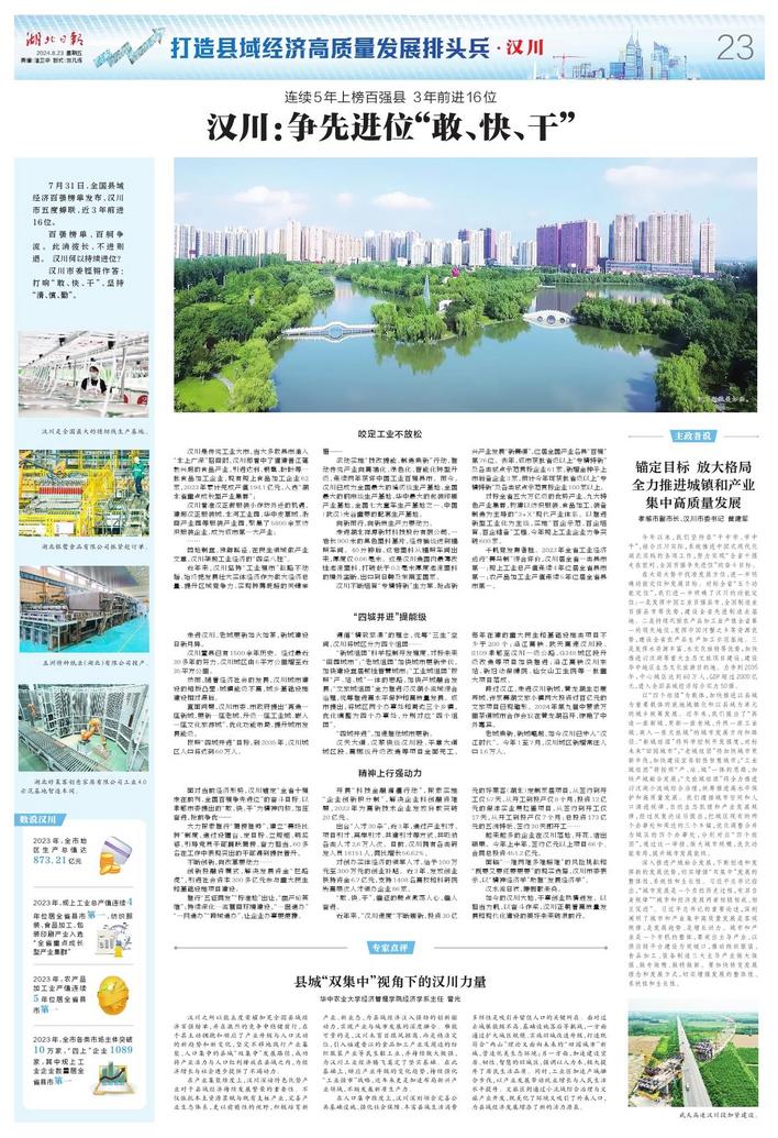 千帆竞发勇者胜。2023年全省工业经济运行“赛马制”综合评价,汉川居全省一类县市第一;规上工业总产值连续4年位居全省县市第一;农产品加工业产值连续5年位居全省县市第一。