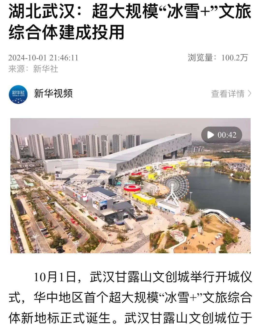 10月1日,武汉甘露山文创城举行开城仪式,华中地区首个超大规模“冰雪+”文旅综合体新地标正式诞生,将进一步促进黄陂国家全域旅游示范区提档升级,助力武汉打造世界级旅游目的地、国际化旅游城市。