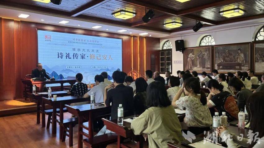 下午,问津讲堂内"诗礼传家 修己安人"儒学交流活动如期举行。孔子第七十六代裔孙孔令君先生深耕文化领域多年,他聚焦孔氏家训中“孝悌、修身、齐家”的核心思想,结合现代家庭生活实际案例,深入解读了传统家训对当代家风建设的启示意义。