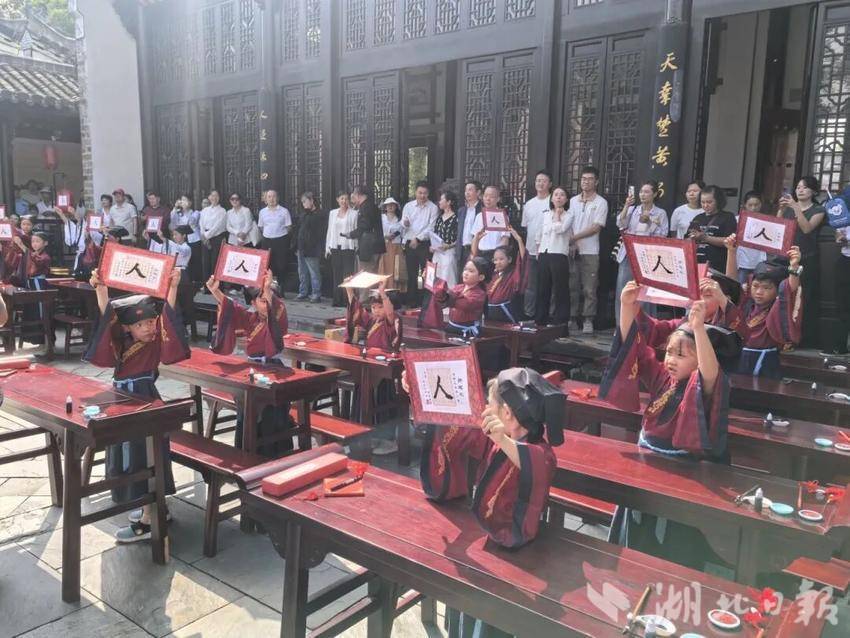 仪式最后,孩子们端坐在书桌前,手握毛笔,在纸上一笔一划地描红“人”字。简单的一撇一捺,却是人生最基础的启蒙——学写字先学写“人”,学做人要走正道。孩子们专注的神情、认真的笔触,让现场每个人都感受到传统文化浸润成长的力量。不少家长举起手机,定格下这承载着文化传承与成长祝福的意义瞬间。