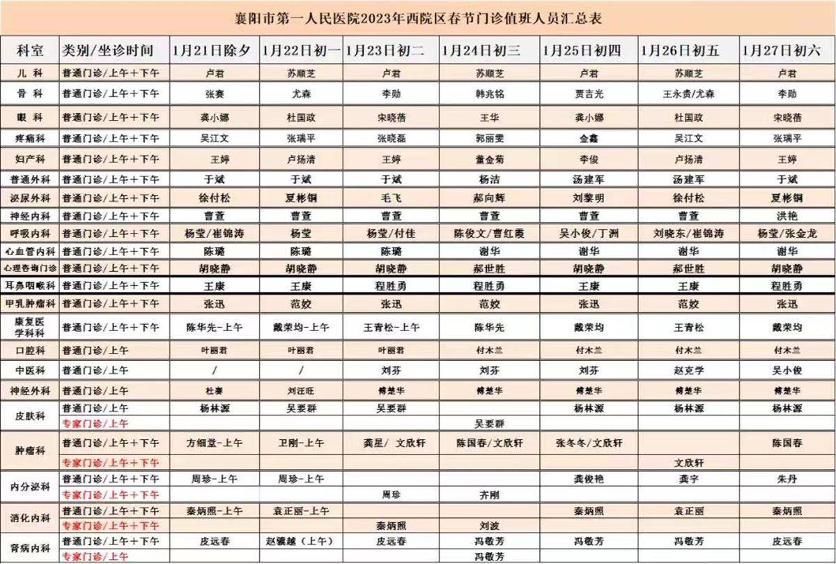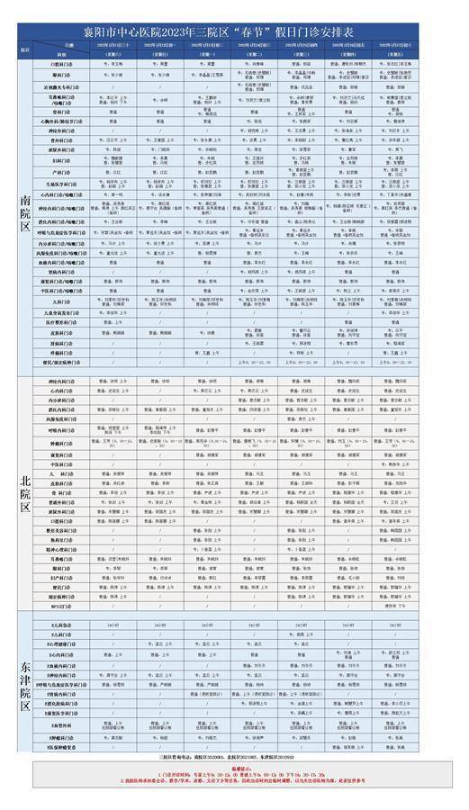 湖北日报客户端讯(全媒体记者刘孝军 通讯员朱秋晨 肖清心 陈文 康健 程贺轶 周征 王娅澐)兔年春节假期即将来临,为方便假期内有就医需求的市民朋友合理安排时间,襄阳城区各家医院诊疗服务不停歇。有需要的朋友赶紧收好这份市区各大医院春节值班表,合理安排就诊时间。