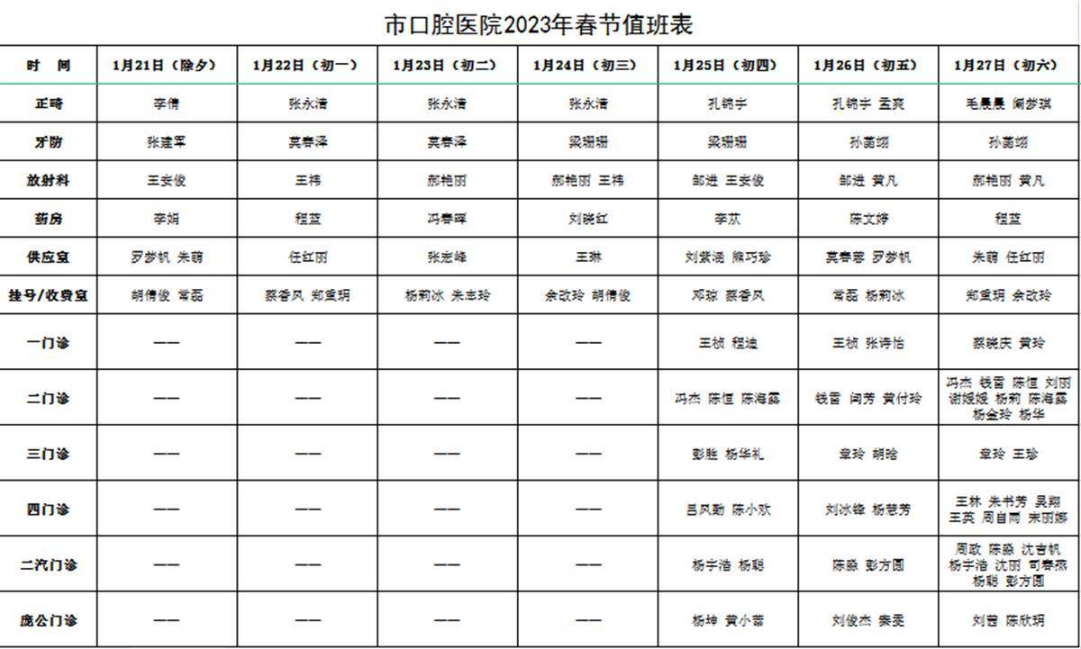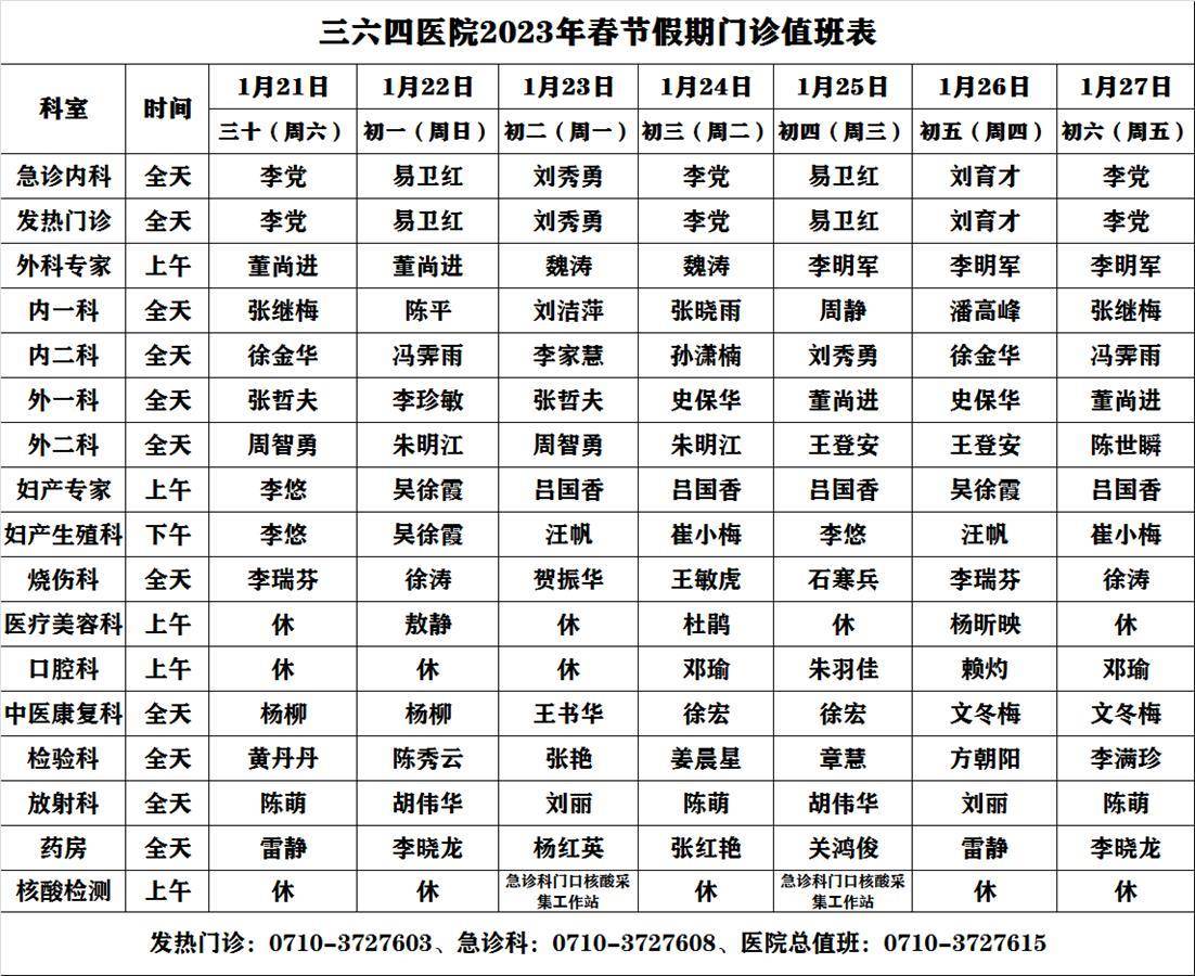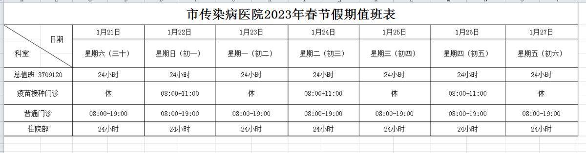 1、普通门诊:2023年1月21日—1月24日,门诊内科、外科、妇产科、儿科、骨科、检验科、超声医学科、心电图室、放射科、中药房、西成药房、门诊一楼导诊咨询台均安排值班。其余时间门诊各科室均按无假日医院工作制执行。