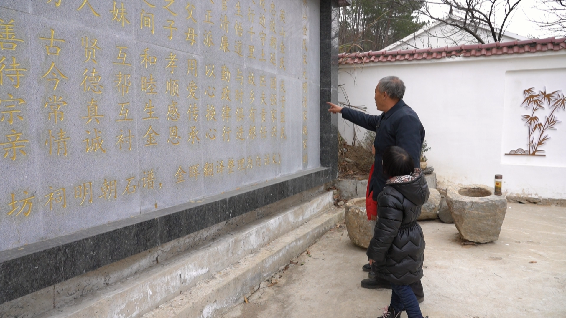 绿色添春意,山村建设新。在英山县金家铺镇杨家河村金上湾湾组内部,清廉湾落的建设正在紧张施工。而在另一侧,今年74岁的金弼新带着家人观看新建成的金氏家风家训墙,以此来教育引导下一代耕读传家。