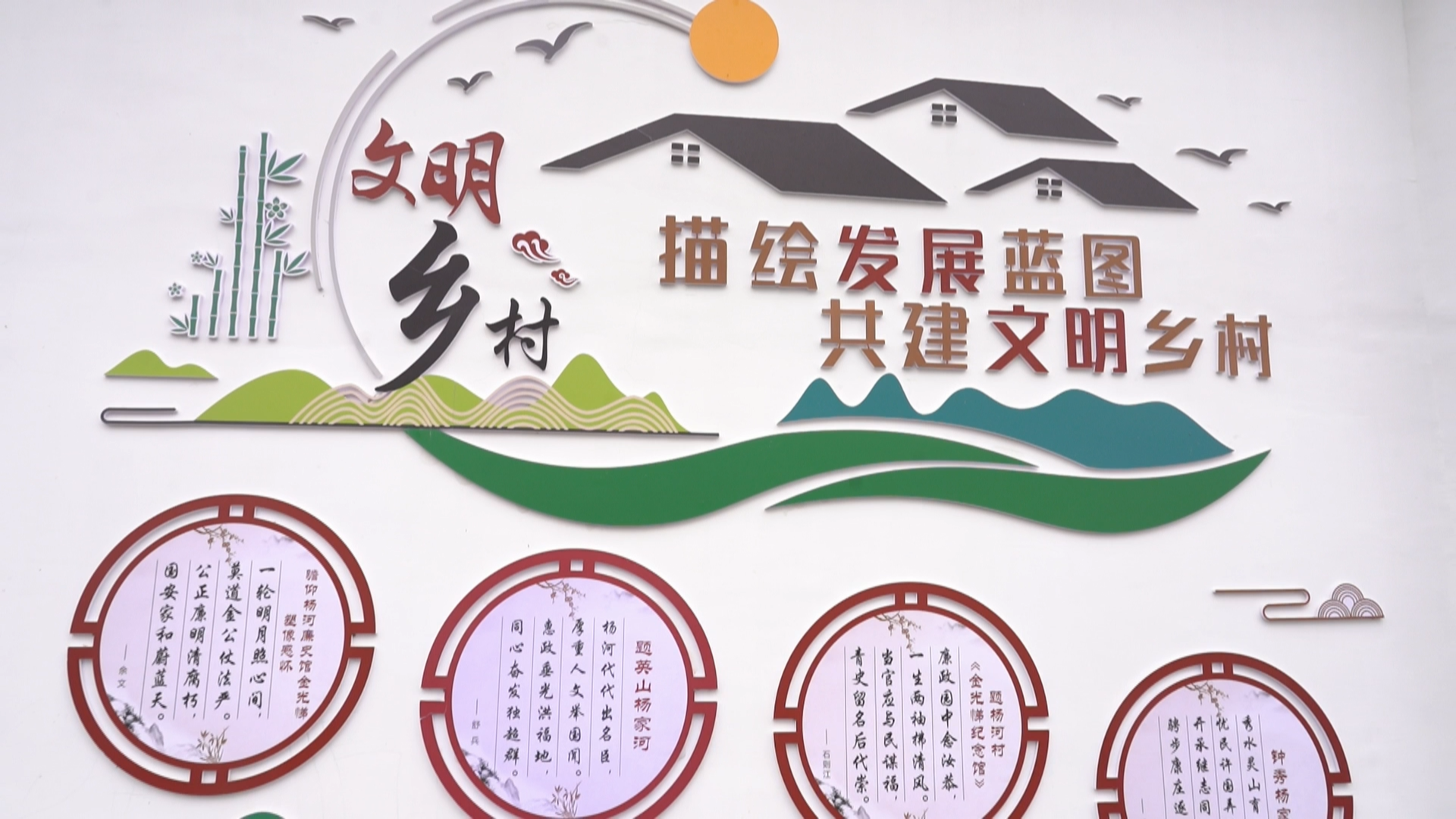不仅在金上湾,村内其他醒目位置,清廉文化宣传广场、长廊内,一幅幅精致的廉政文化墙绘和一条条通俗的廉政警示标语随处可见,深入推动生态宜居村庄建设,廉洁文化成了杨家河村文明风尚的“净化器”。