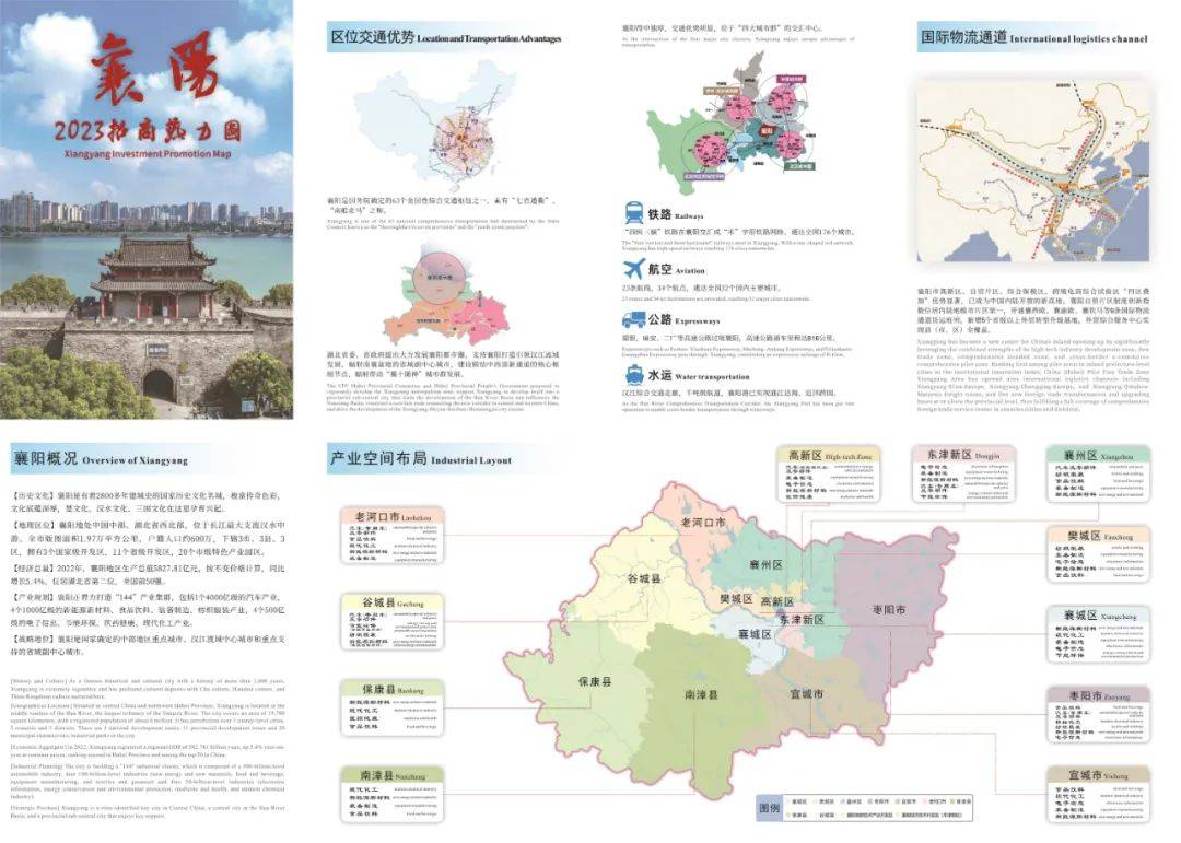 在“襄阳2023招商热力图”上,我们可以看到,热力图立足襄阳市空间维度、产业维度等,围绕“144”现代产业集群目标及13条先进制造业产业链、十大重点农业产业链,全方位展示了襄阳市 区位交通优势、国际物流通道、产业发展现状、发展方向、产业空间布局等特点。同时以投资者需求为核心,以轻纸张、简内容、一目了然的招商模块为指引,全面简洁直观反映 襄阳优势、愿景和环境,努力为投资者前来投资创业 提供独具特色的“襄阳名片”。