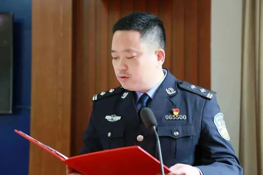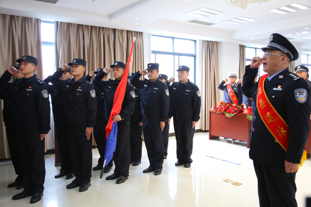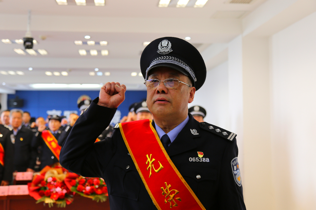 退休民警代表胡文华发表了工作感言,将象征责任与重托的人民警察警旗传递到青年民警手中,并领誓人民警察誓词。