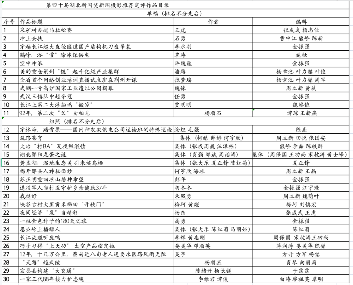 受湖北省新闻工作者协会(简称省记协)委托,湖北省新闻摄影学会组织专家学者及部分媒体负责人,对申报第四十届湖北新闻奖新闻摄影作品进行初评,确定30件作品参加第四十届湖北新闻奖定评。