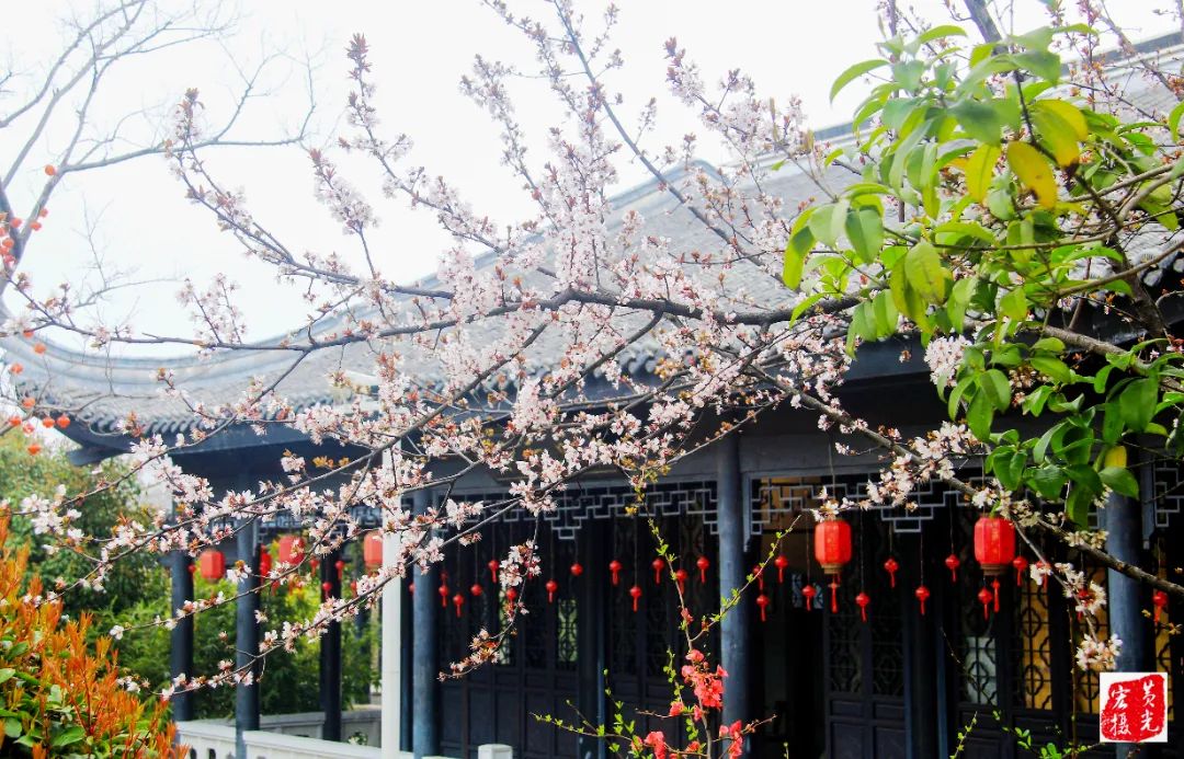 古朴的亭阁,花开在屋檐