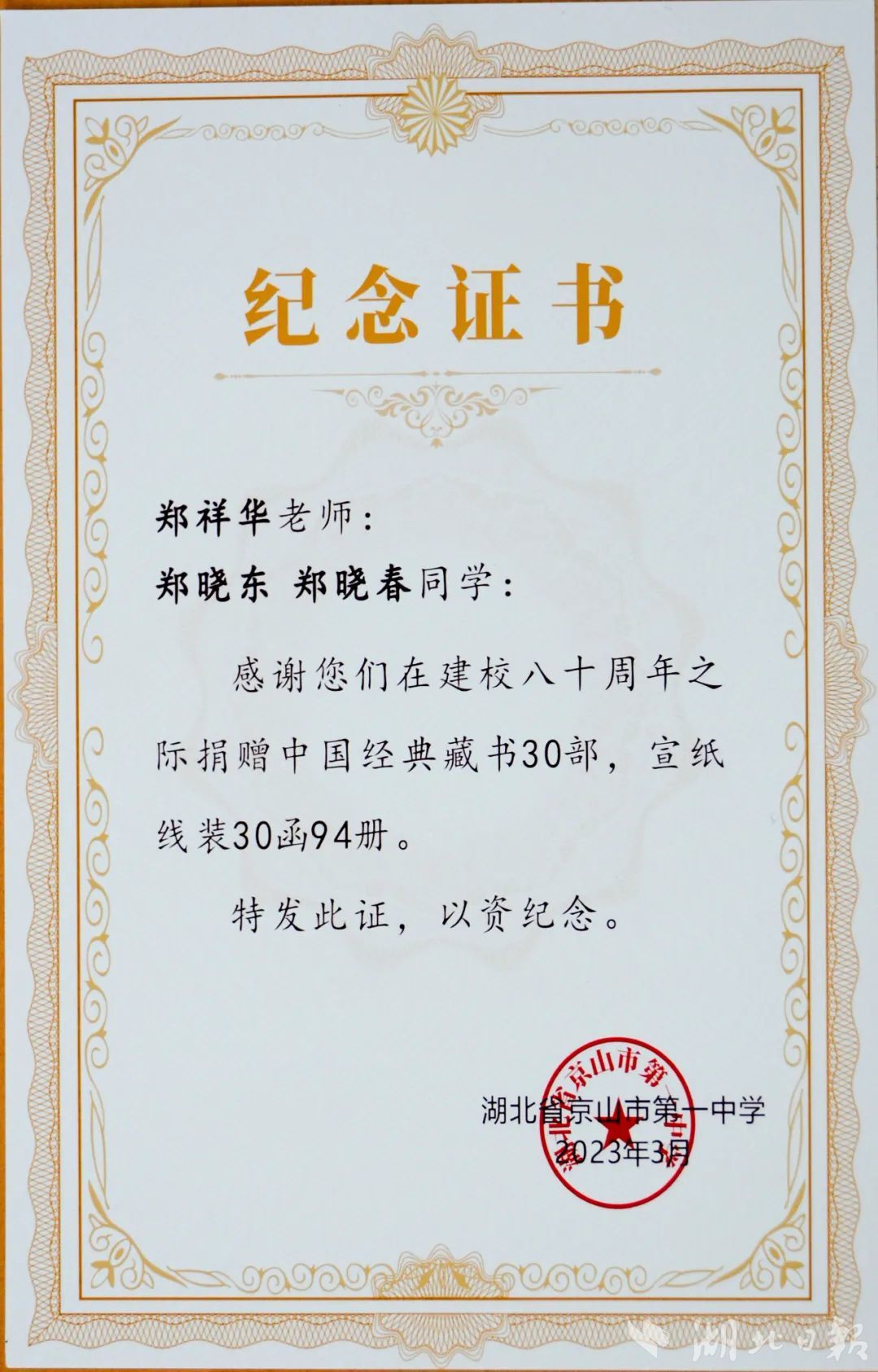 湖北日报客户端讯(通讯员代志丰、廖志刚、尤玺君)3月17日,京山一中退休老教师郑祥华及其子女郑晓东、郑晓春捐赠“中国经典藏书”系列共94册,用于支持京山一中的教育发展。