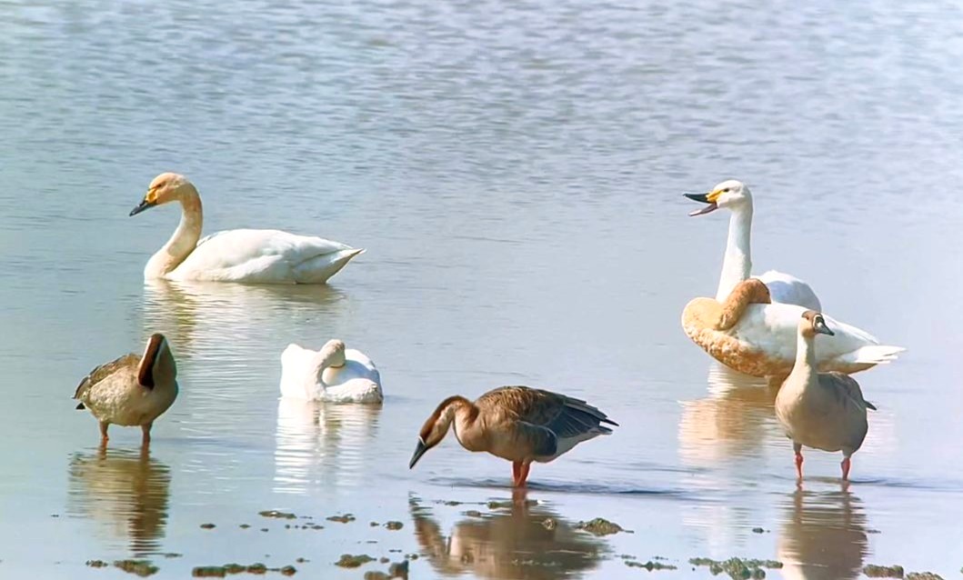 走在湖堤上,远处白天鹅点点,近处白天鹅“团团”。定睛细看,“团团”的白天鹅有的把头埋藏在丰盈的翅膀下梳理着温润的羽毛,有的把头扎入水里捉鱼吃虾,有的昂首挺胸呼唤着伴侣孩子,有的振翅飞翔,盘旋在湿地上空。粗哑的“呖”“呖”声,粒粒滚落在游人头顶上,滴落进浅水里。