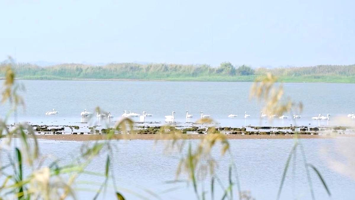 在湖堤边,有一台望远镜,扫码后,可以清晰看见白天鹅艳红的喙嘴、圆溜的黑眼、雪白的长脖子,可以看见它们在水里自由游弋的高雅身姿。幸运的话,可以看见成对的鸳鸯戏水秀恩爱的情景。那一只只远看不见的白鹤、灰雁、苍鹭、东方白鹤等,它们在望远镜前尽显美妙的身影。黄盖湖湿地俨然成了鸟的天堂。