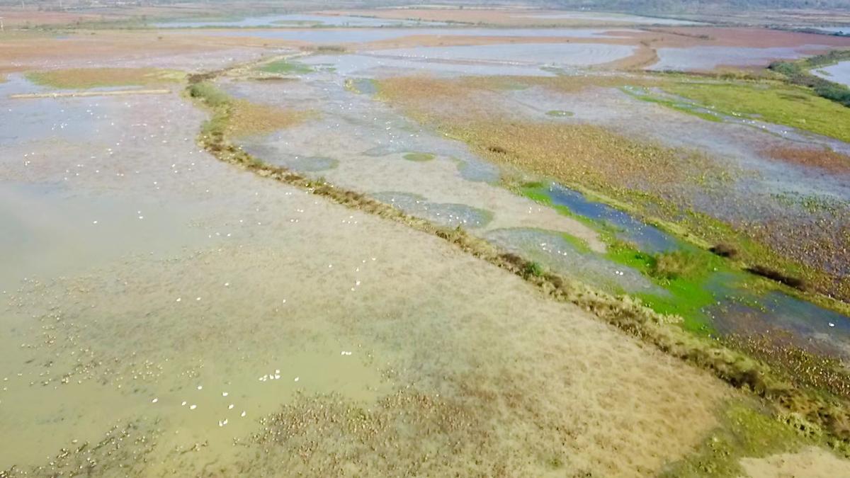 在黄盖湖东北角,延伸着一片方圆几十里的湿地,湿地正中有一条长堤蜿蜒开去,把湿地一分为二。近几年的冬天,湿地飞来了成百上千的白天鹅,白天鹅把它们临时的家安置在湿地茂密的水草、枯荷丛中。它们安闲地在这儿生儿育女,调养生息。