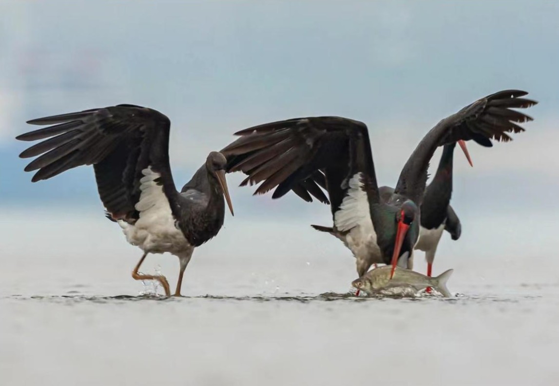 湖北日报客户端讯(通讯员熊铭、余祖云、陈建平)近日,石首市野保志愿者在长江石首段,捕捉到黑鹳捕鱼的画面。黑鹳是国家一级保护野生动物,因数量稀少,被誉为“鸟中大熊猫”。