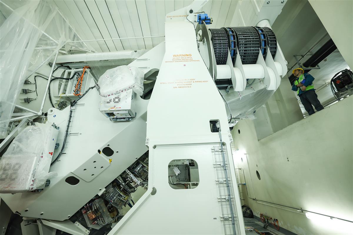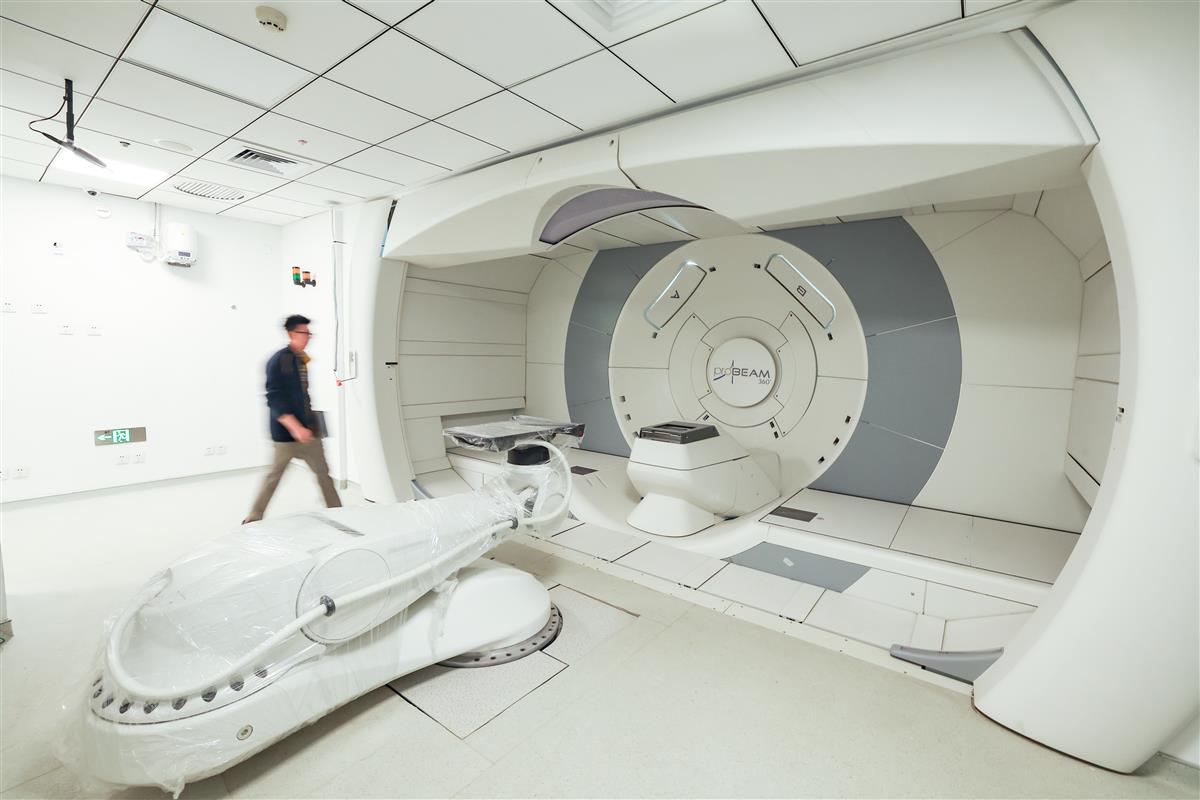 2023年4月4日,在武汉市东西湖区金银湖畔协和医院质子医学中心内,工作人员正在对设备进行安装调试。目前,质子中心建设工作全部竣工,进入验收和最后设备调试阶段。据协和医院金银湖院区副院长郭科介绍,武汉协和医院质子医学中心是全国首批、中南唯一的质子中心,占地约50亩,总建筑面积2.55万平方米,一期投入7亿元,引入国内首套Probeam360°质子肿瘤治疗多室系统,设置4个治疗舱。质子放射治疗将质子射束直接输送到肿瘤处并集中释放,同时最大限度地减少对周围健康组织和器官的损害,治疗精度可控制在1毫米以内。质子医学中心投用后,将快速带动和提升湖北省乃至我国中南地区的肿瘤诊疗水平,填补质子治疗的空白,每年可为超过1000名患者服务。(湖北日报全媒记者倪娜 通讯员涂晓晨 王成摄)