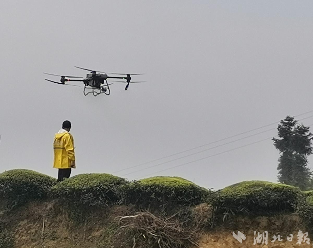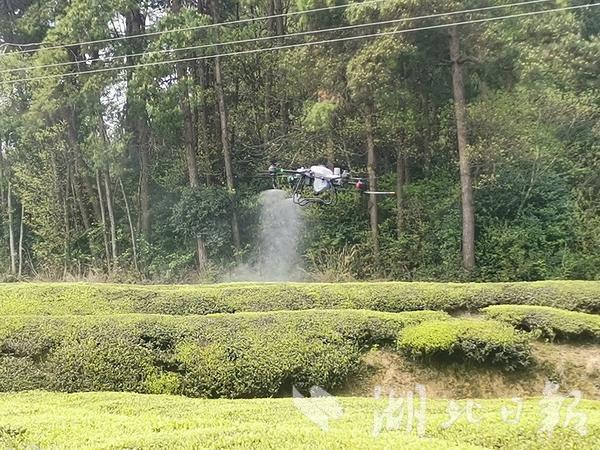 4月10日,在铁炉白族乡三旺村八组的有机茶园里,一架装满药水的农用无人机缓缓升空,在嫩绿的茶叶上方几米高的位置来回穿梭,向茶树叶面上均匀喷洒茶叶叶面肥。
