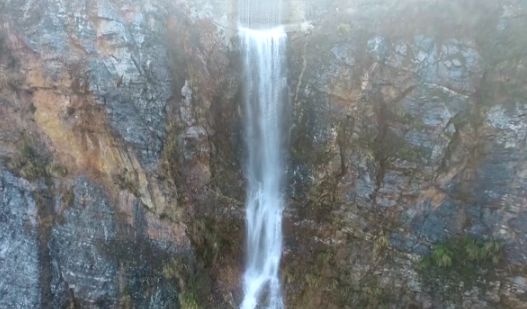 沿景区主干道步行爬坡,到达山顶悬崖。悬崖顶上高山草甸一望无垠,草地顺着山势起伏,站在悬崖边能够俯瞰整个景区,远处的油菜花海、采矿旧址尽收眼底。草甸下,50米高的山顶瀑布飞泻而下,落入碧蓝的湖水中,激起阵阵水花,在山间湖面形成一层轻纱般薄薄的水雾。