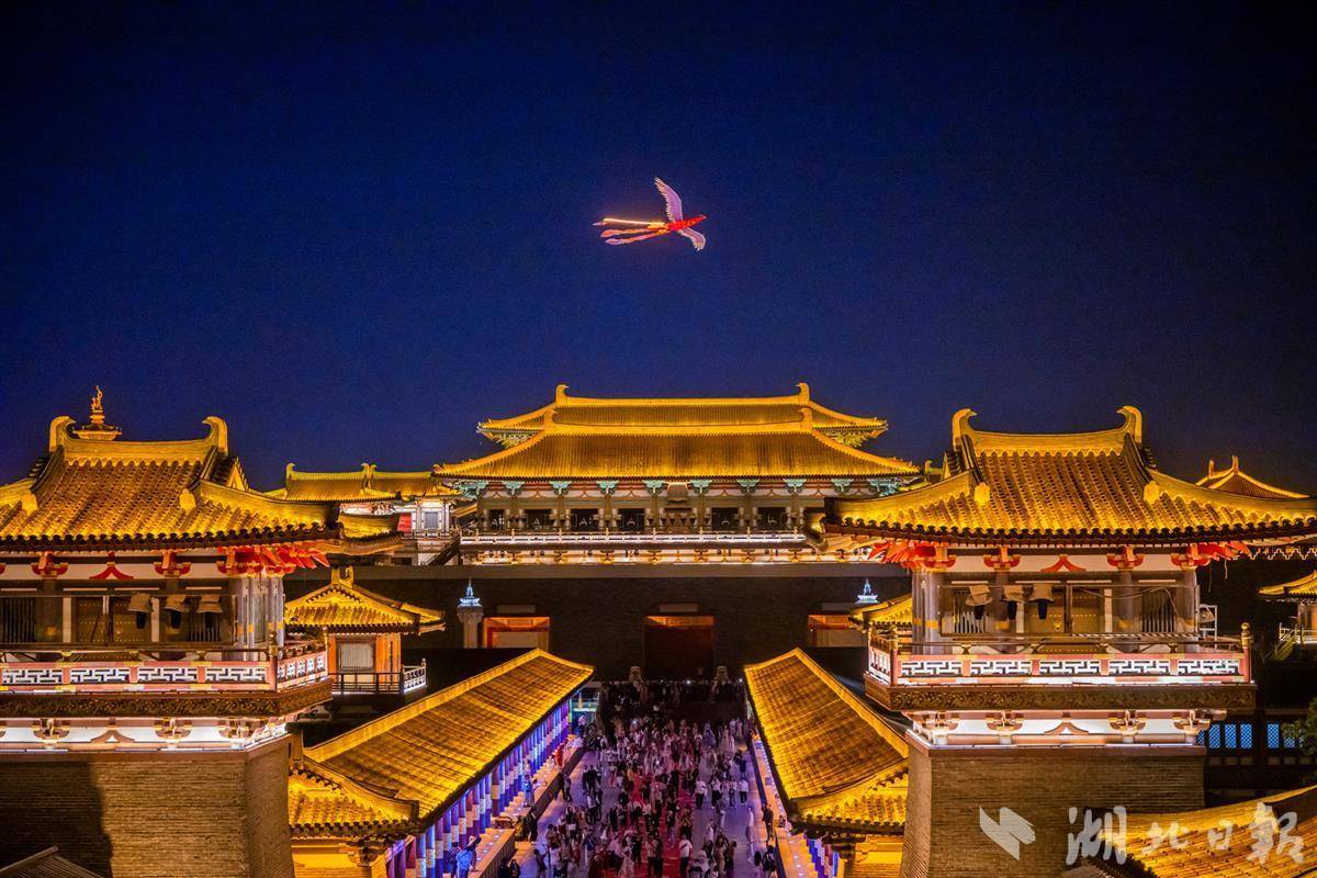 湖北日报讯(记者胡梦思、通讯员黄杰、何梦琴、张莹)5月1日,夜幕降临,襄阳唐城景区被灯光点亮。晚风醉人,游客身着汉服,三两成群,跟随汉服巡游队伍,行走在仿唐建筑和热闹的街巷,轻纱飘飘、珠钗摇曳,恍如穿越至盛唐。