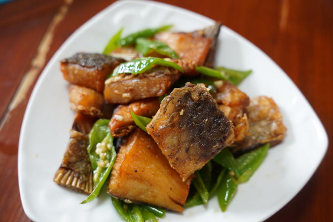 蒜苔炒五花肉,蒜苔脆嫩,肉味鲜香。经过腌渍、晾干,煎烧而成的糍粑鱼块块入味。
